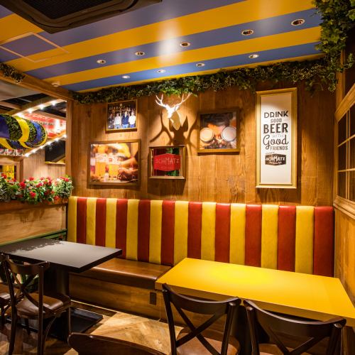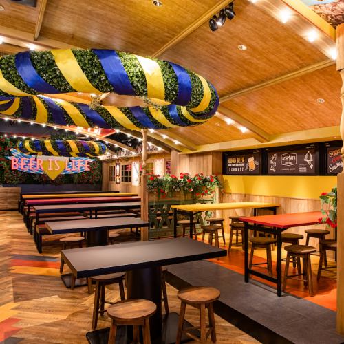 时尚的室内装饰会让您感觉仿佛置身于当地的啤酒吧。墙壁上装饰着从当地进口的时尚物品,一定能拍出很棒的照片!还设有适合从少数人到多人的各种场合使用的桌席。请在宴会、女子会、生日会、团体约会、聚会等各种场合使用。